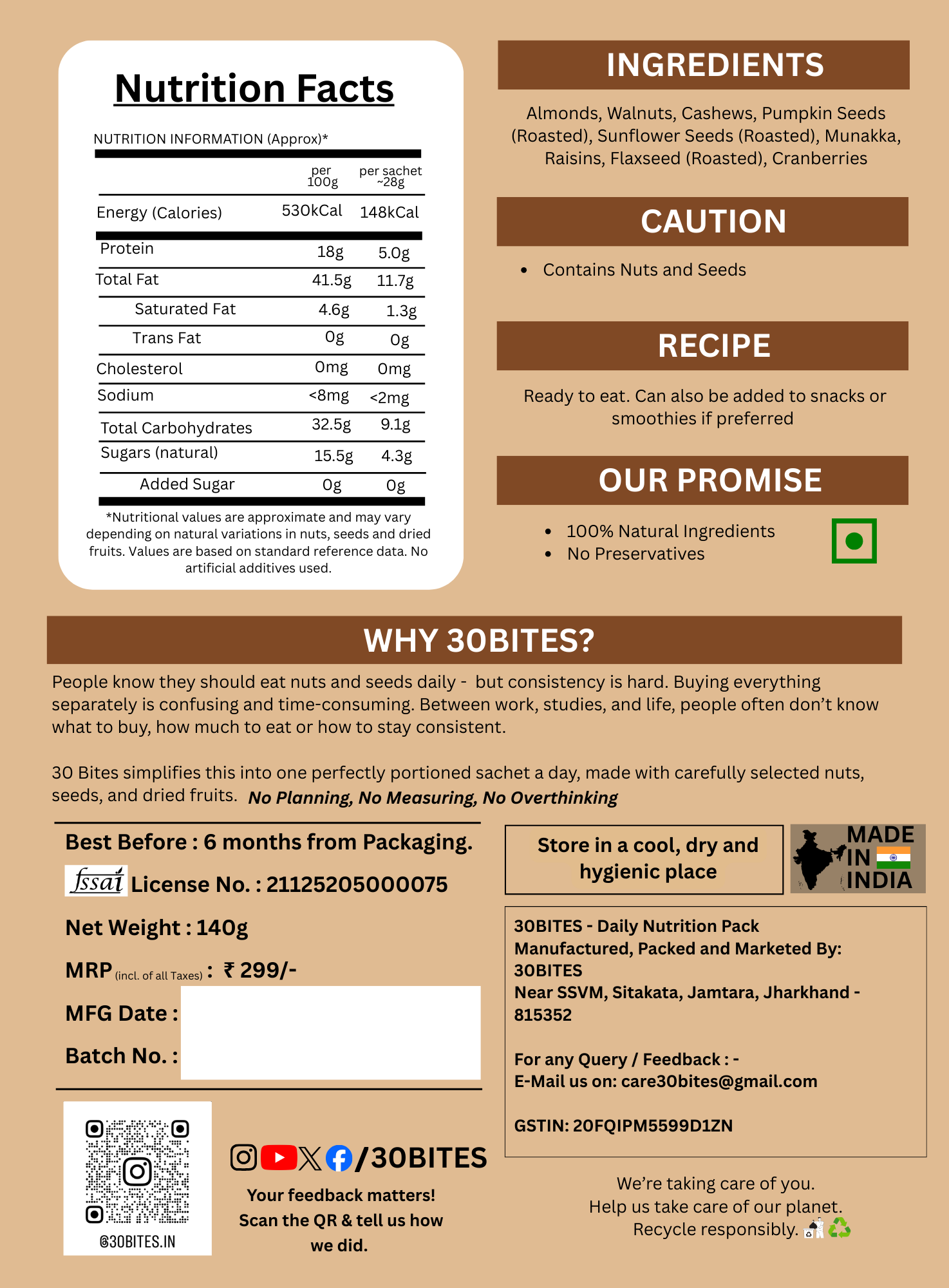 30 Bites is a perfectly portioned daily nutrition mix made with premium nuts, seeds, and dried fruits to help you build a consistent healthy habit without planning or measuring.